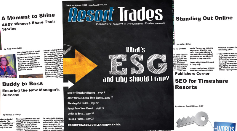 06.23 Resort Trades Timeshare & Hospitality Magazine: ESG, Standing out onlie, seo, timeshare, ardy, arda, boss, buddy, manager, success, pooch, and proof.