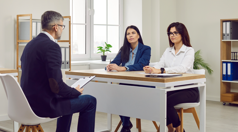 Two Business Women Office Employee Interview Man In Office
