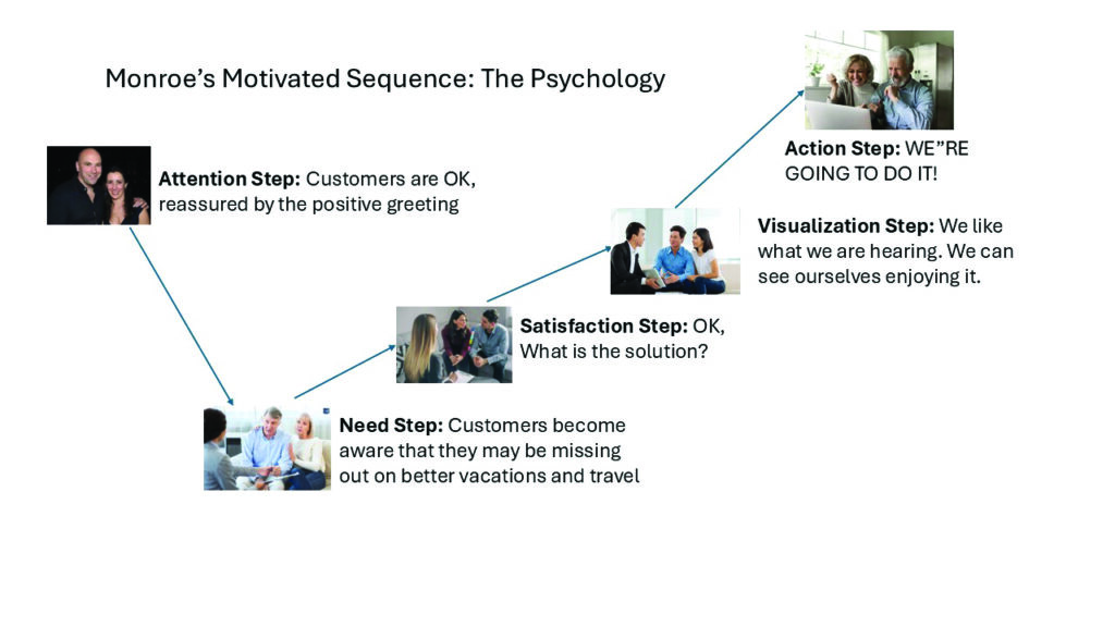 Monroe’s Motivated Sequence may not be a secret after all. Maybe great salespeople have, instinctively, more or less, been using an effective and psychologically sound process all along. Now, however, the process not only has a name, but it has a front of mind structure to apply to successful sales. Thank you, academia.