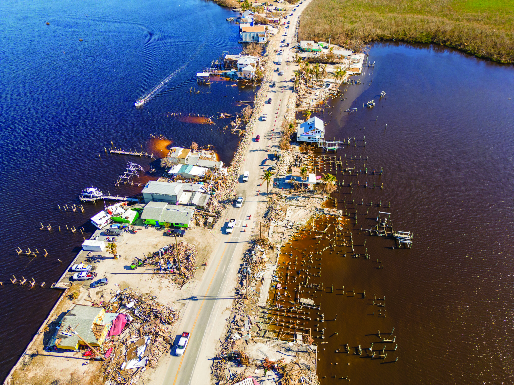Aerial drone inspection photo Matlacha Florida Hurricane Ian aftermath damage and debris from flooding and storm surge