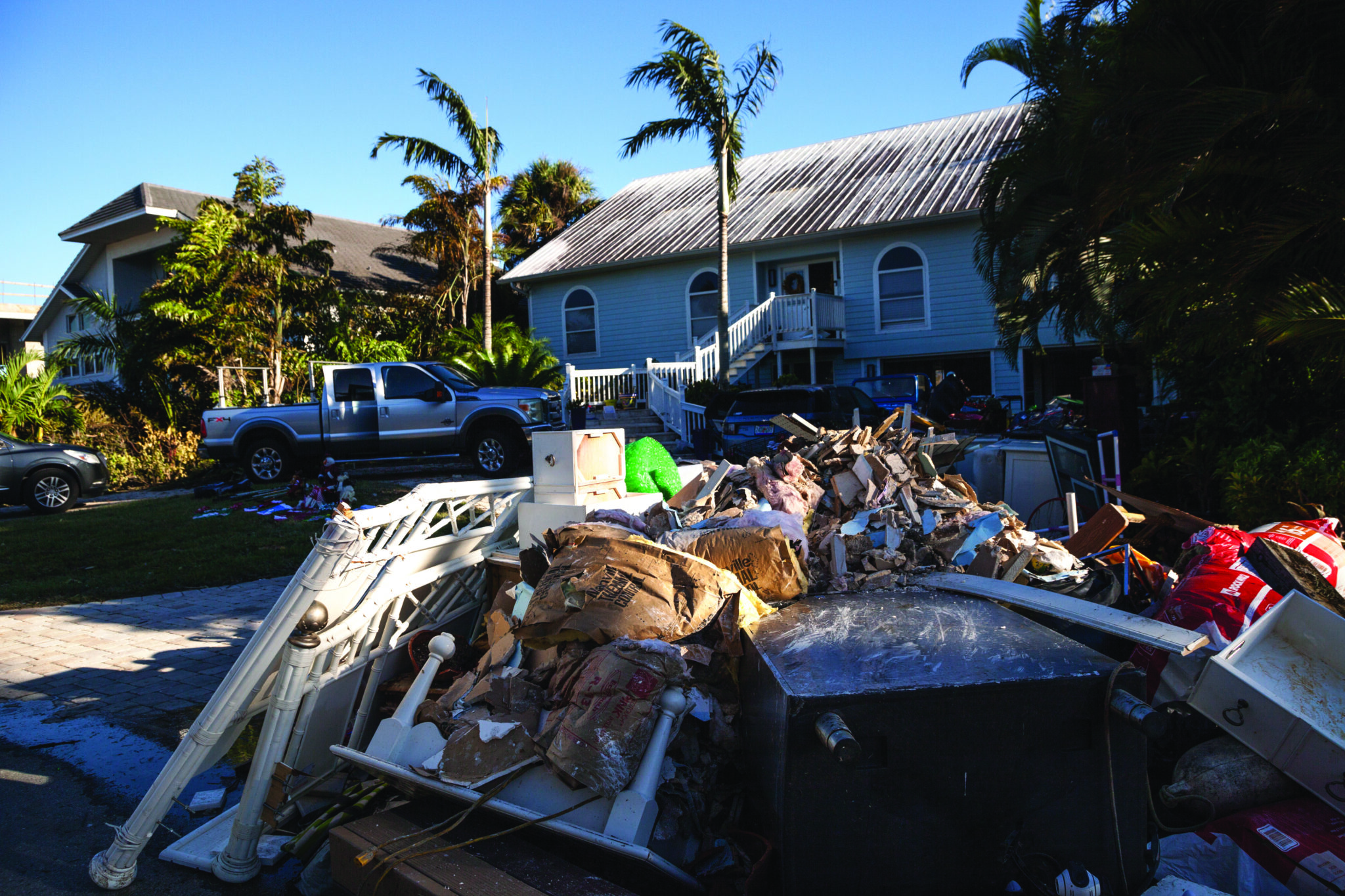 Naples, Florida, USA – September 28, 2022: NEWS Debris including personal items alongside flooded homes after Hurricane Ian in Naples, Florida. Editorial only
