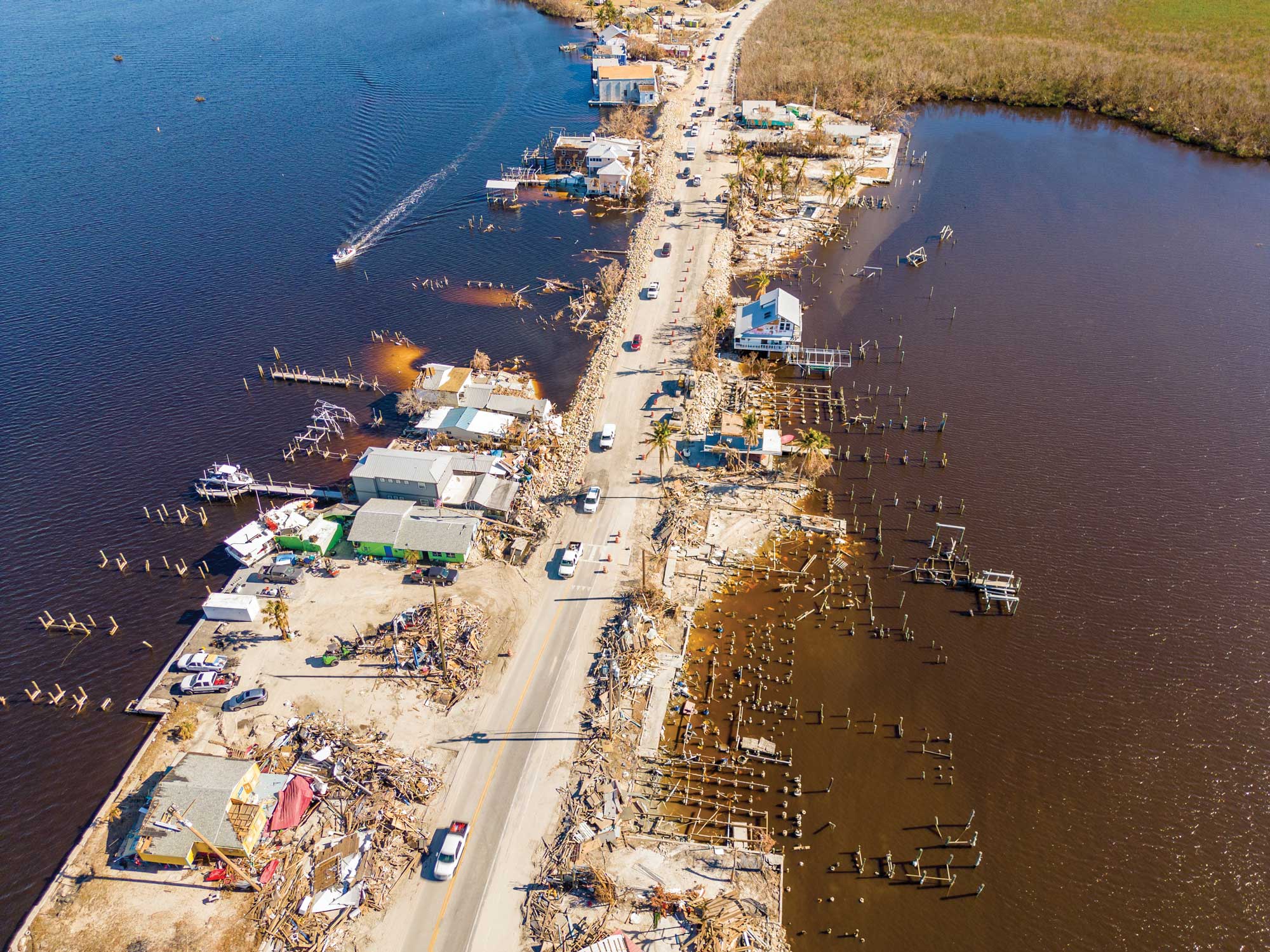 Aerial drone inspection photo Matlacha Florida Hurricane Ian aftermath damage and debris from flooding and storm surge Circa October 2022